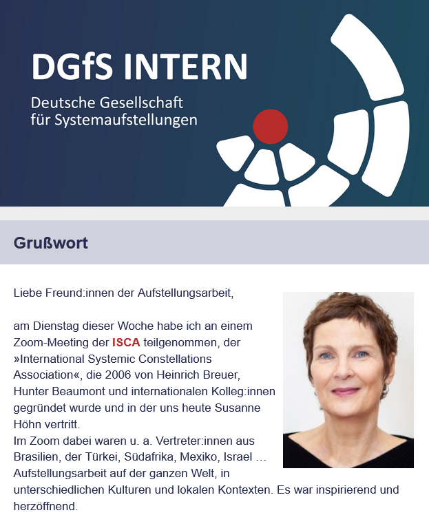 Die Deutsche Gesellschaft für Systemauf-stellungen, DGfS, ist ein berufsübergreifender Fachverband von Psychotherapeut:innen, Berater:innen in psychosozialen Bereichen und Organisationen, Ärzt:innen, Heilpraktiker:innen, Pädagog:innen und anderen Berufsgruppen, die mit Familienaufstellungen oder allgemeiner mit Systemaufstellungen arbeiten.
